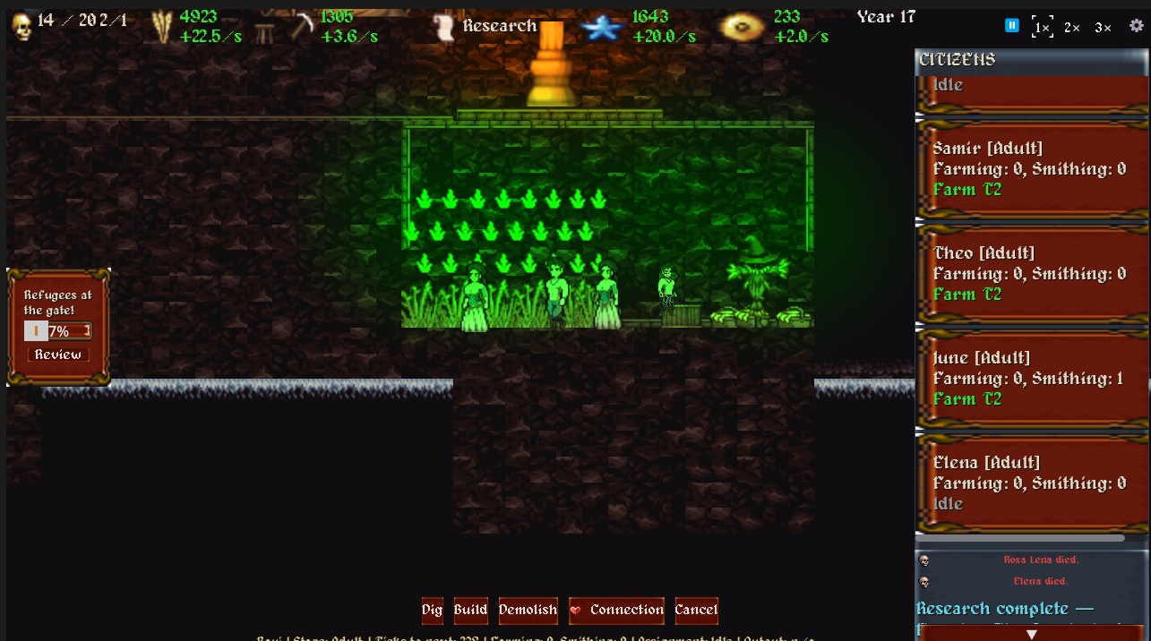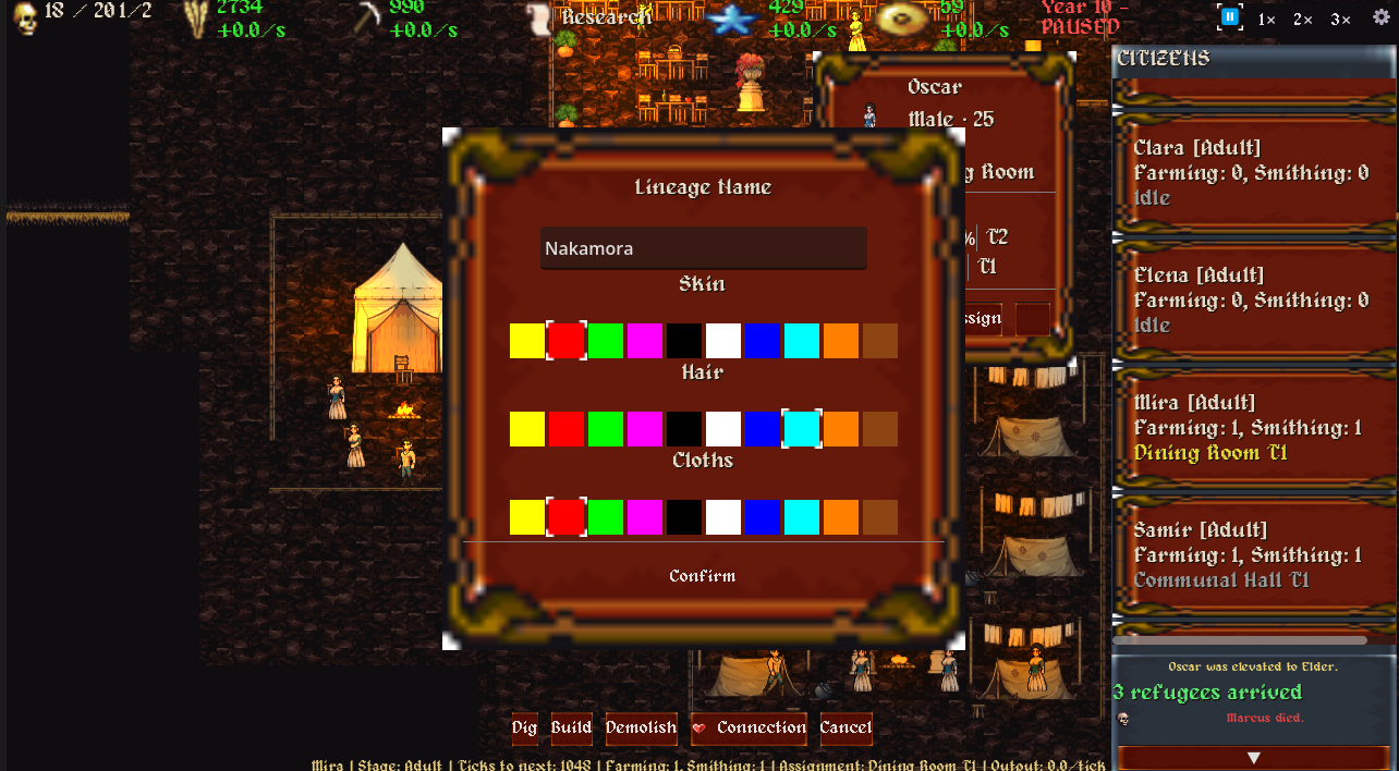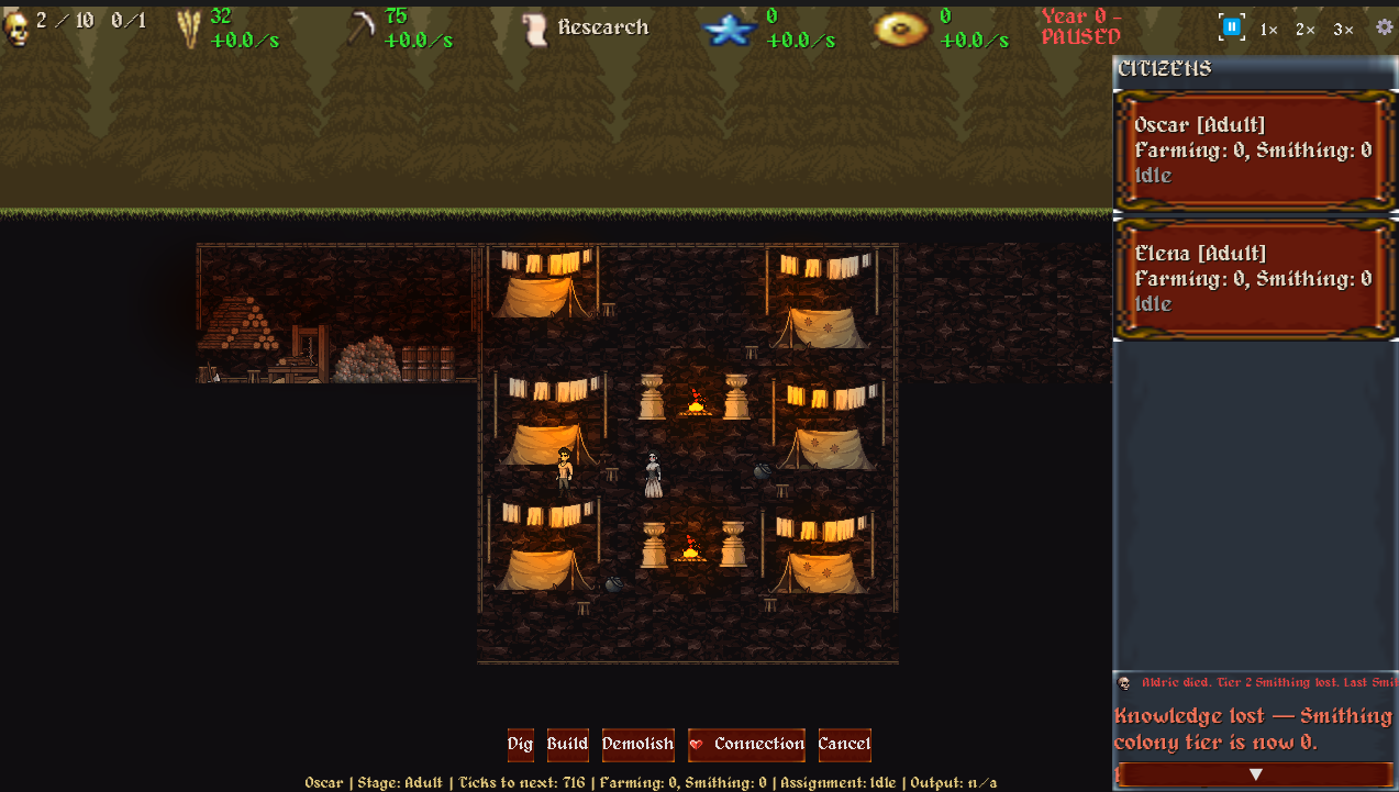 Carve your colony into the rock. Assign workers. Train apprentices before your elders die. Elevate the worthy to elder status and watch lineages form across generations — children inheriting the skills and names of their parents.